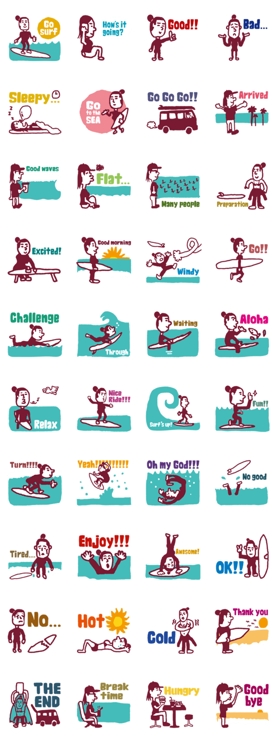[GO SURF]のサーフガール版。 男版と同様、海へ波乗りに行く時に使えるスタンプ。 わかりやすい単語が多いので、サーフィンをやらない人も日常で使えます。