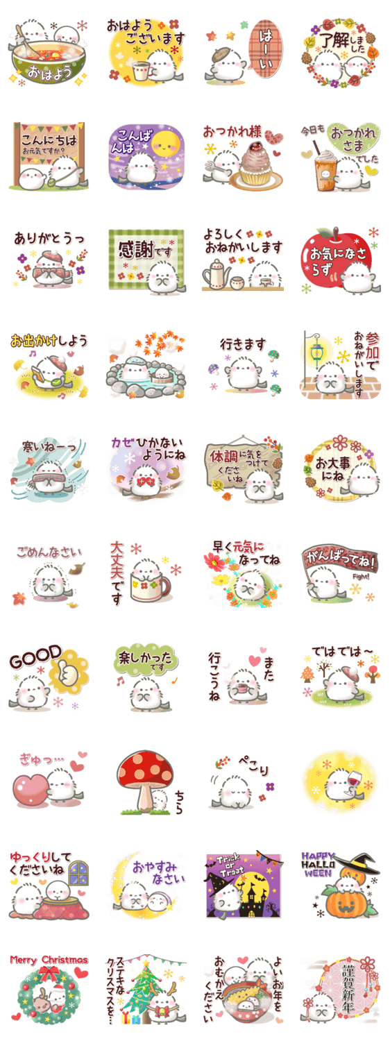 ほっこり秋冬カラーのシマエナガのスタンプです。毎年使える便利な言葉、やさしい気遣いの言葉など。挨拶やねぎらい、イベントなど、寒い季節のトークを優しく彩ります。