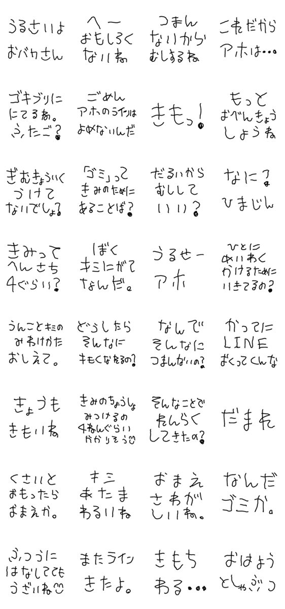 | スタンプ説明 | 5歳、5才、子供、子ども、ネタ、悪口、煽る、ギャグ、かわいい、文字スタンプ、友達、家族 |