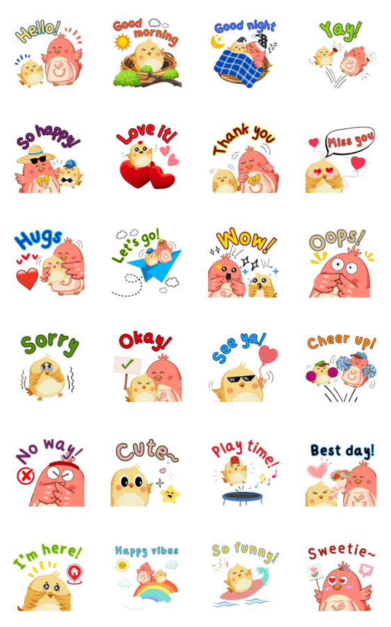 | スタンプ説明 | A cheerful mother bird and her colourful, cute little bird come with commonly used English words |