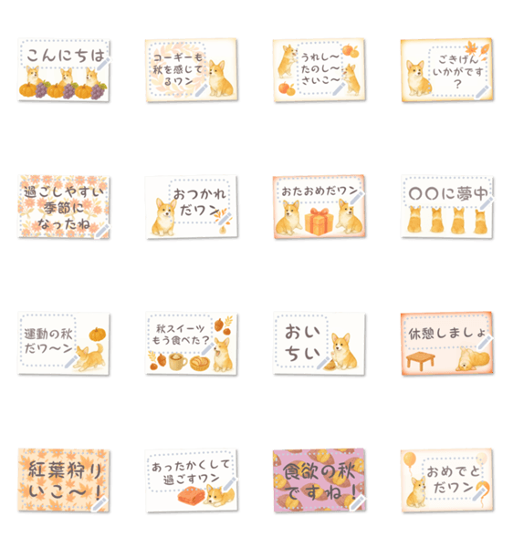 好きな言葉を書き込める♪焼き芋やカボチャ・葡萄・紅葉・プレゼント・栗やお花とほっこり可愛いコーギー犬のハガキ型グリーティングカード♥秋を感じるメッセージスタンプ 現在この商品は一部のスマートフォン版LINE 10.3.0以上のトークルームでのみ使用できます。動作環境の最新情報はヘルプをご確認ください。