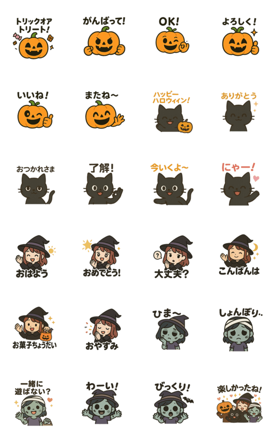 黒猫・かぼちゃ・魔女・ゾンビのかわいいハロウィンスタンプ!こわかわで楽しい♪