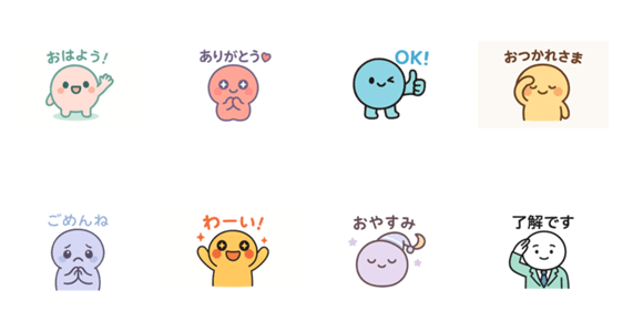 おはよう、ありがとう、おつかれさまなど、毎日のコミュニケーションで使いやすいシンプルでかわいいまるもちスタンプです。