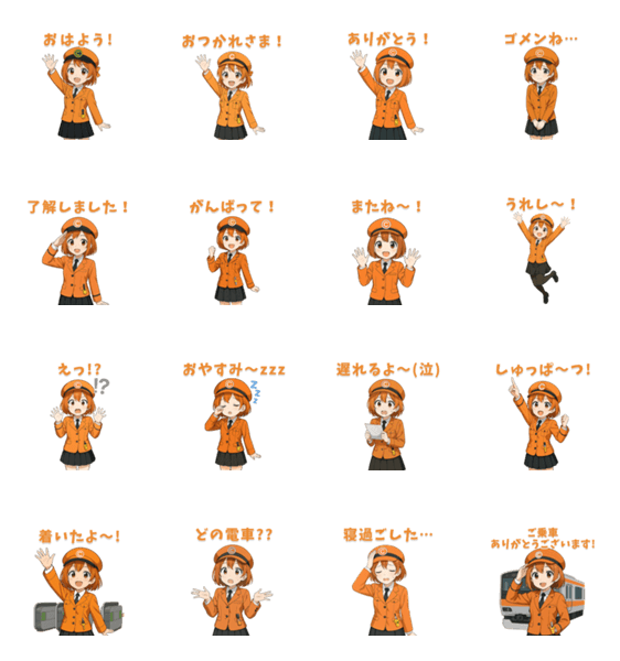 | スタンプ説明 | オレンジ色の駅員ガールが毎日をサポート!「おつかれさま」「がんばって」など使いやすい日常フレーズがそろっています。 |