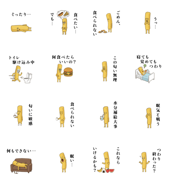 日々のつわりに耐えるあなたへ。 気持ち悪そうなポテトから、やっと落ち着いたポテトまで。 妊娠中の「あるある」を代弁してくれるスタンプです。