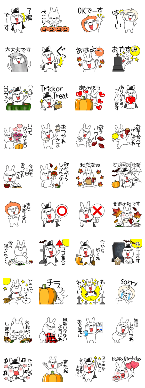 ハロウィンスタンプ入り毎日使えるブサ可愛いウサキの秋を感じるスタンプです
