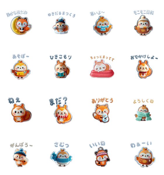 冬の森をテーマにした癒しのスタンプ。ことり・りす・きつねが雪やぬくもりを届けます。優しい色合いの16個セット。