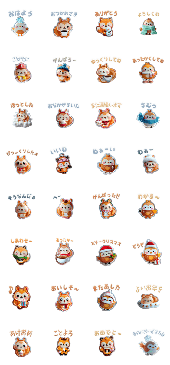 雪のきらめく森で、ことり・りす・きつねが冬の暮らしを満喫。あたたかい言葉がいっぱいの、ぷっくり透明感スタンプ32個セット。