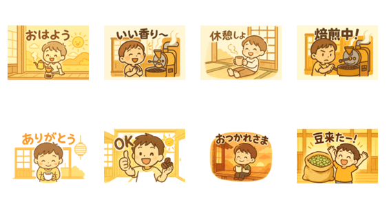 古民家で珈琲焙煎を楽しむ男の子のスタンプ。挨拶から感謝まで日常会話で使いやすい8種類。珈琲好き・焙煎好き・古民家好きな方へ。