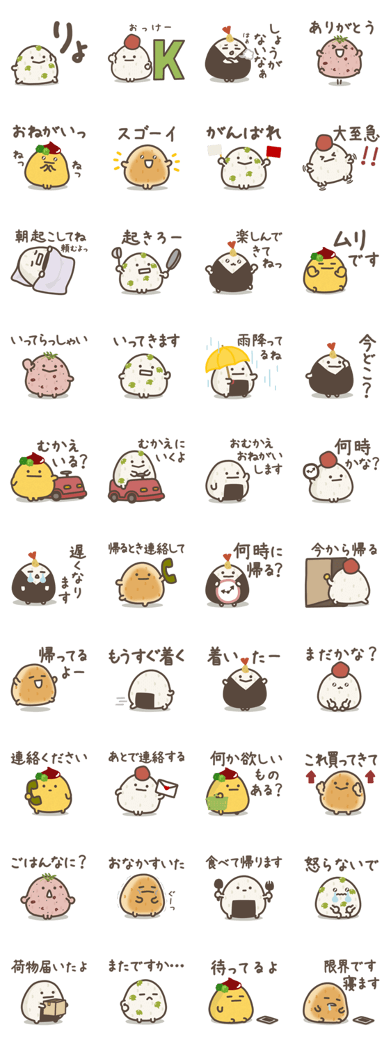 ゆる~いおにぎりたちの家族連絡に使えるスタンプです♪彼氏彼女、親しい友達にも使いやすいよ♡