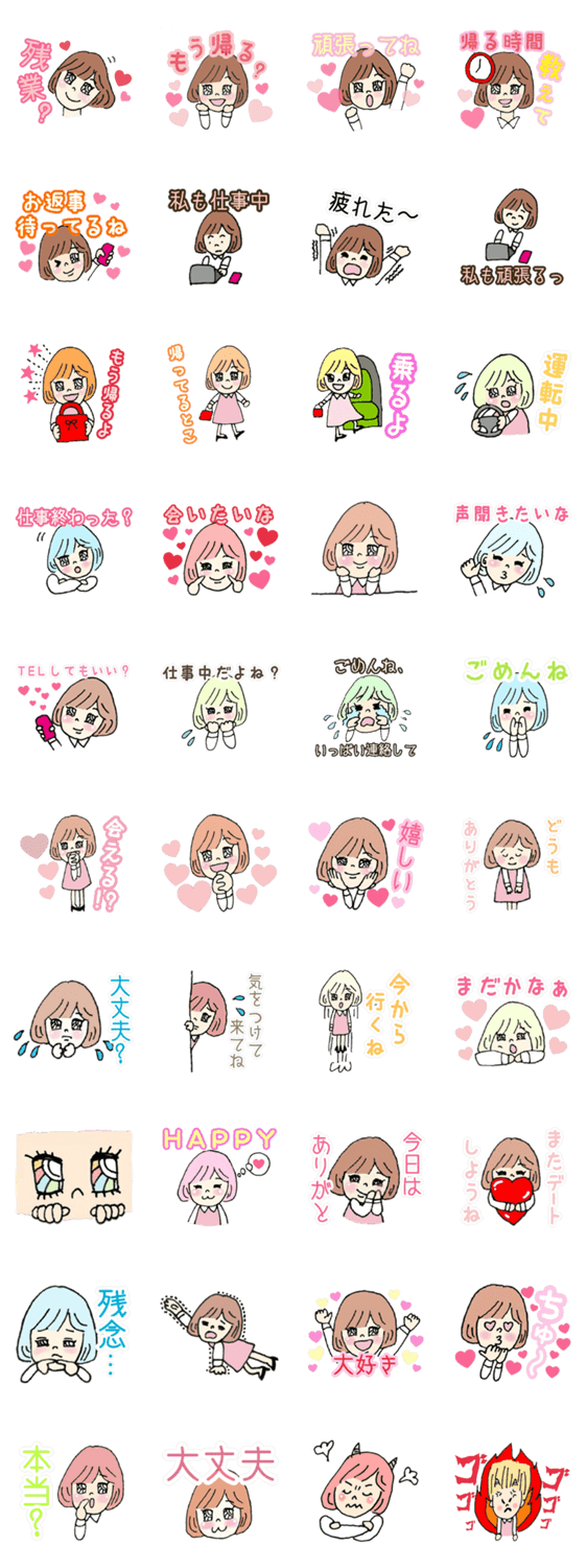 仕事が終わると髪の色がカラフルになるおしゃれなボブヘアガール。彼へかまって攻撃したい方にオススメ★彼氏だけでなく友達にも使える可愛いハート満載なスタンプです♪