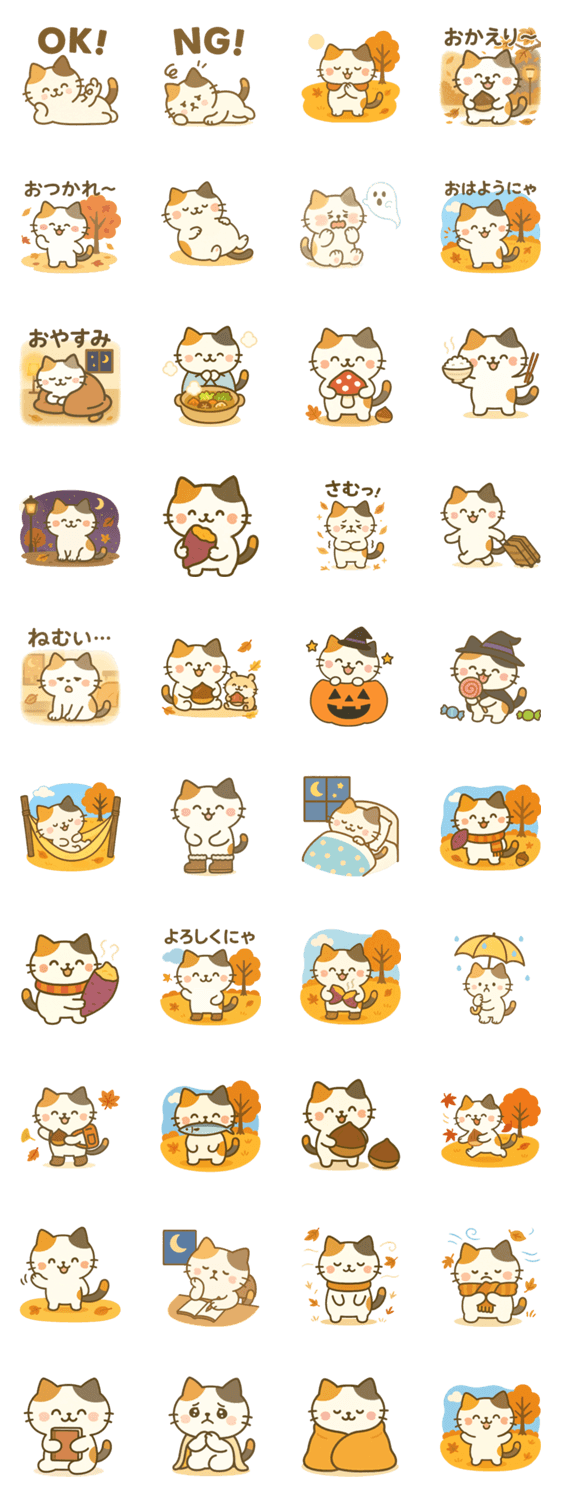 やる気ゼロ。でも憎めないミケタローのゆるスタンプの第四弾! 秋満載なイラストをお届けします。 ゆるかわトークで毎日ほっこり♪