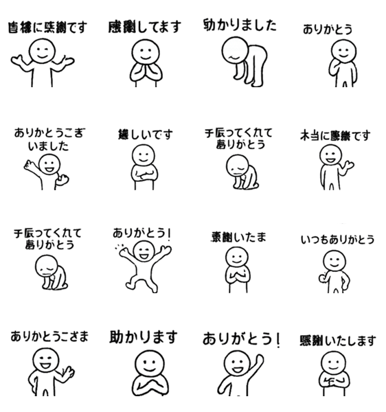 ありがとう、感謝してます、助かりましたなど、感謝の気持ちを伝えるスタンプです。日常のやりとりからビジネスシーンまで、心を込めて「ありがとう」を伝えられます。