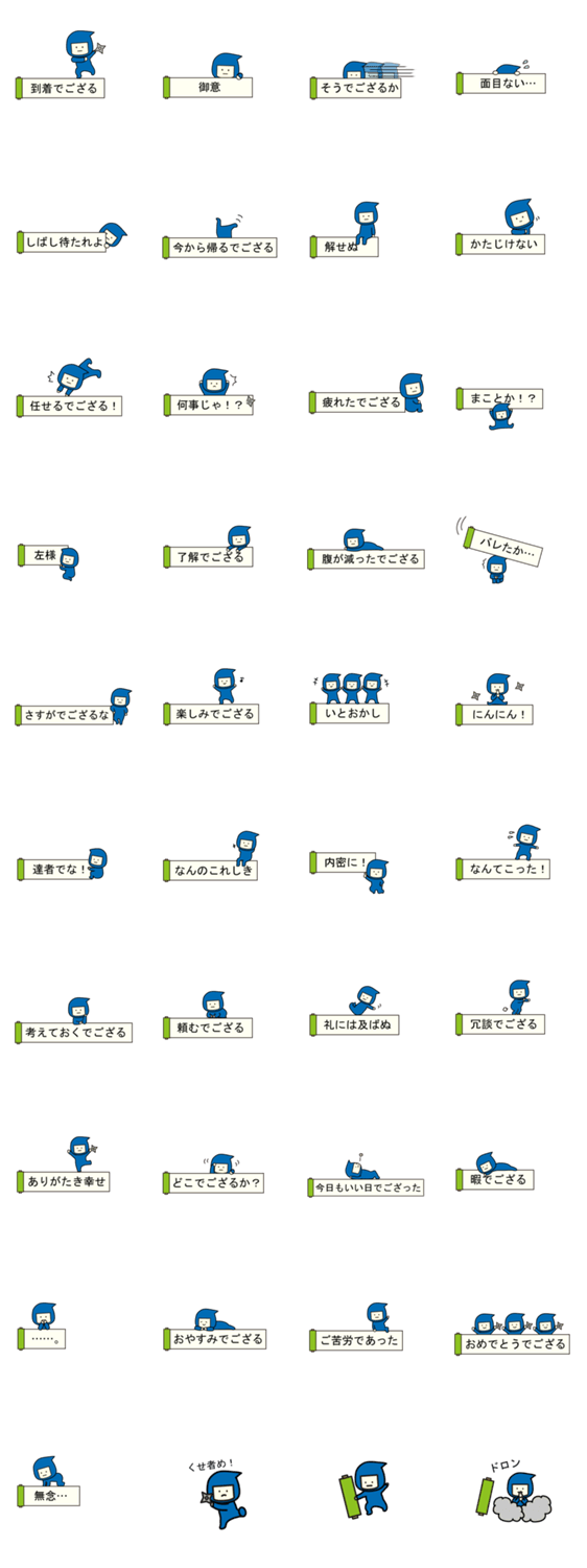ふきだしに見立てた巻物でメッセージを送ります。普通の吹き出しスタンプじゃ物足りないって方にオススメ!武士語でちょっぴり個性を出せます!小さな可愛い忍者です。