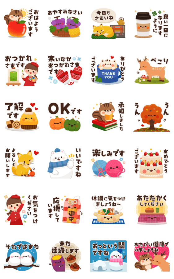 毎年の秋~冬に使える♪便利で日常使いしやすい言葉をたくさん集めたスタンプです! 年末年始/ハロウィン/誕生日おめでとう/挨拶/受験/寒い