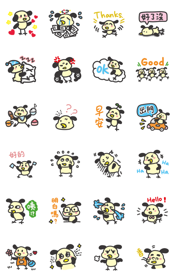 | スタンプ説明 | A dog with a bird's beak, a pair of wings, and slender, delicate bird legs. Focused on enjoying life to the fullest-eating, drinking, and having fun. |