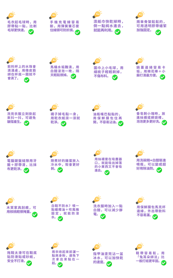 第1弾に続く実用的な生活の裏ワザスタンプ。日常をもっと便利にする新しいアイデアが満載です。