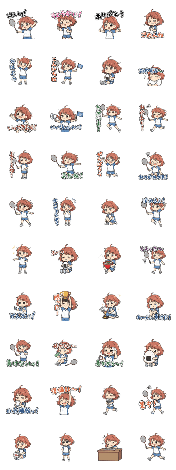 バドミントン部の女子です。可愛いちびキャラが元気いっぱい!挨拶から部活動まで毎日使えるリアクション満載のセット。日常会話や友達とのやりとりにどうぞ♪