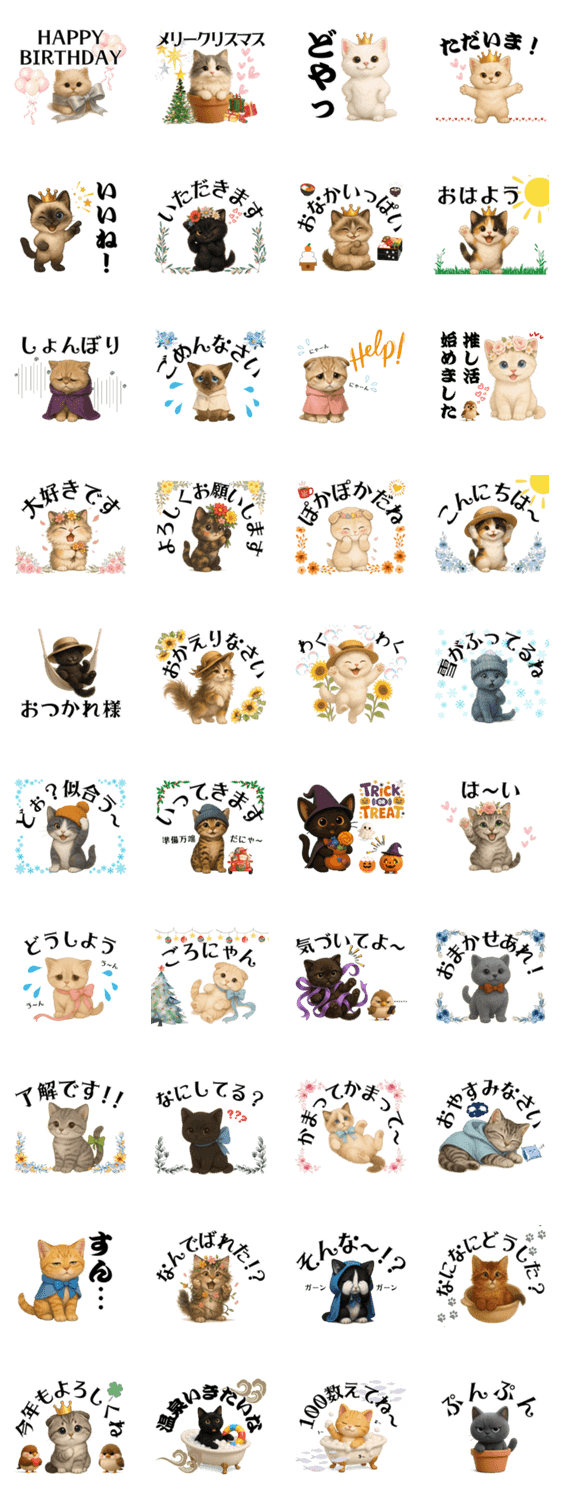 ふんわり可愛いネコが毎日のあいさつや気持ちを伝えるスタンプ。おはよう・ありがとう・ごめんから、誕生日やクリスマス、ハロウィンなどイベントにも使える便利なセット