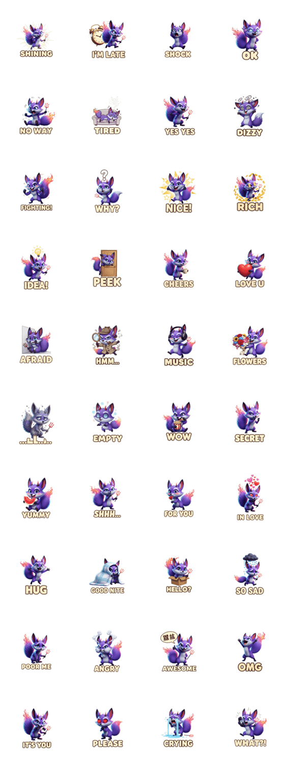 | スタンプ説明 | 悪魔の炎をまとうキツネが恋に落ちる。ミステリアスで情熱的な恋愛スタンプ。 |