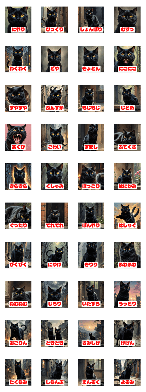 表情豊かな黒猫が、日常のあらゆる感情をお届け! 「にやり」「しょんぼり」「ぷんすか」など、気分にぴったりのリアクションが見つかるよ。