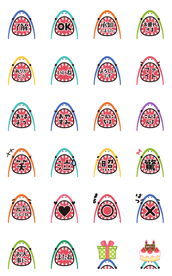 | スタンプ説明 | 簡単な返信で使いやすい サメの開いた口に文字が表示される、ポップアップスタンプです。了解 OK いいね おつかれさま ありがとう など 誕生日スタンプ付き! |