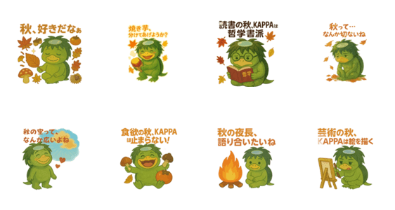 | スタンプ説明 | These kappa LINE stickers capture the essence of autumn. They let you feel the beauty of the season. (KAPPA to AKI o kanjirukoto ga dekimasu.) |