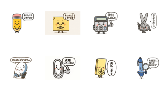 かわいい文房具キャラクターによるビジネス向けの丁寧な挨拶スタンプです。