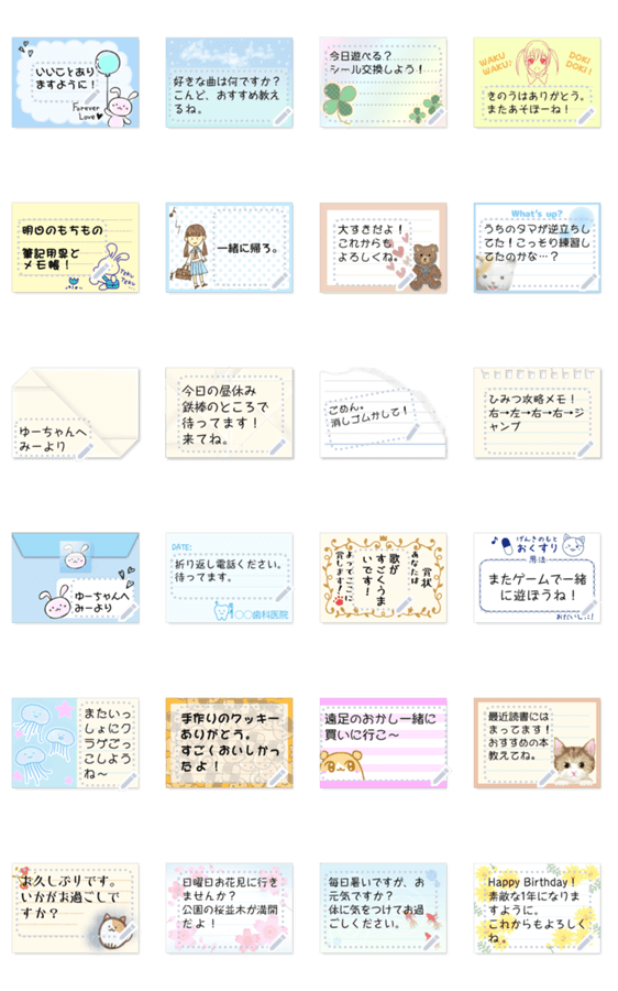 平成レトロなメモ(+おまけ)をスタンプにしました!懐かしい平成女子なかわいい柄や、小中学生に人気のおもしろいパロディ柄、定番の使いやすいメモで、手紙交換しよう♪ 現在この商品は一部のスマートフォン版LINE 10.3.0以上のトークルームでのみ使用できます。動作環境の最新情報はヘルプをご確認ください。