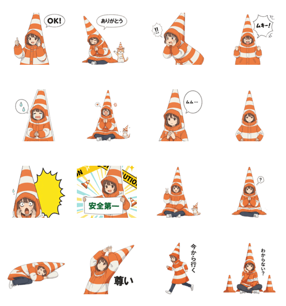 安全大好き!三角コーンの格好をした女の子「橙縞(とうじま)コン子」が登場! いろんな場面で使えるあいさつスタンプです。