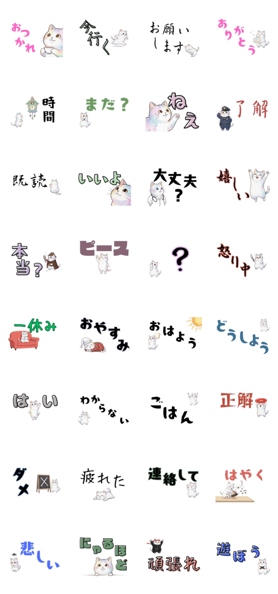 猫の感情に乗せて大きな文字をつけてみました。視力の悪い方にも見やすいです。日常会話からセリフを揃えたのでとても使いやすいと思います。