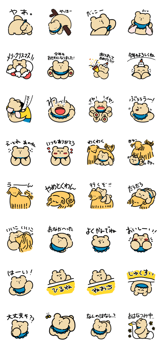 | スタンプ説明 | 青いスタイのくまちゃんと、世話好きなわんこのスタンプシリーズ。 仲良しなふたりの日常をお届けします。 |