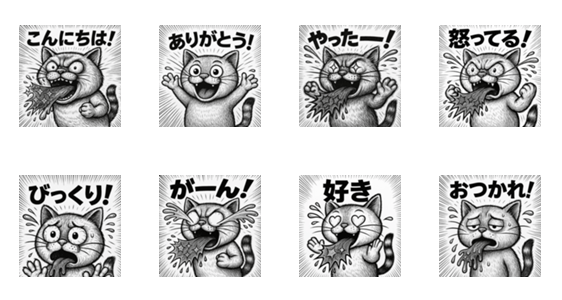 | スタンプ説明 | どんな気持ちもキラキラで表現! 喜びも怒りもぜんぶ水と一緒に放出する、テンションMAXの猫スタンプ |