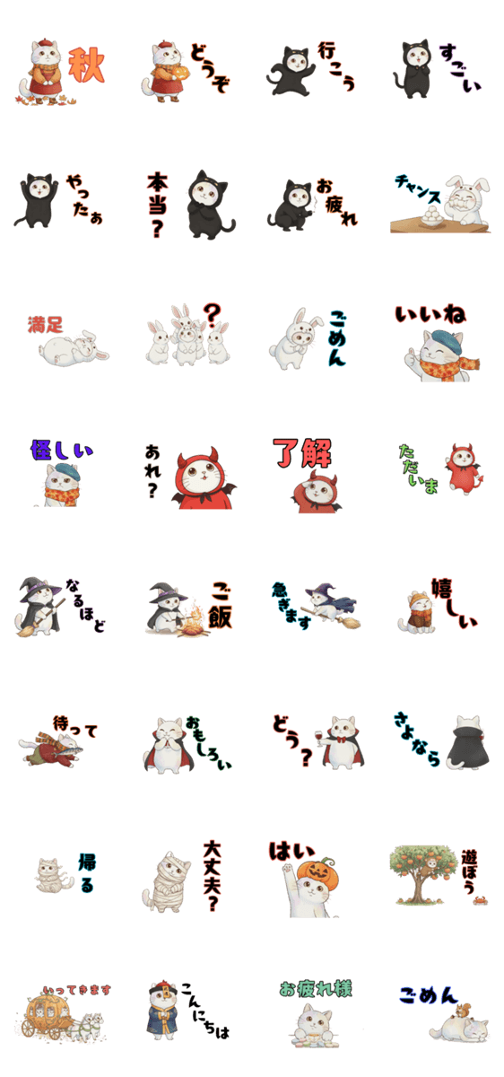色んなハロウィン衣装の猫や秋服の猫が喜怒哀楽を表現しています。 友達、家族、恋人、色んな場面で使えます。