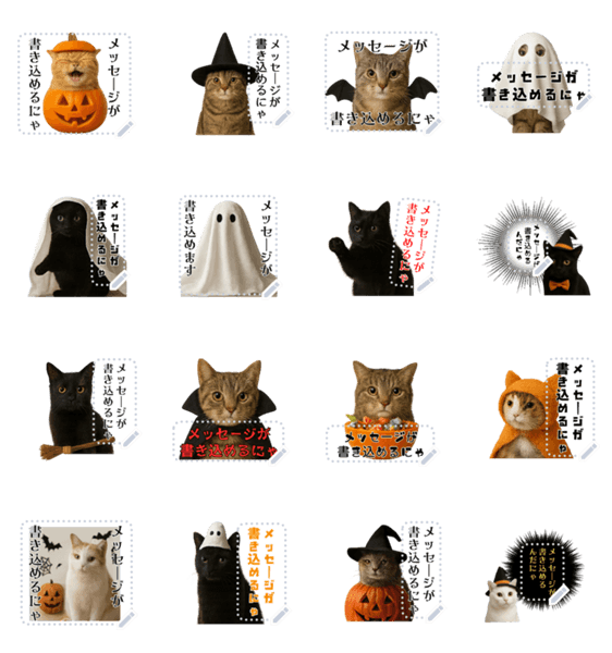 自由に文章を書き込める♡秋を感じる猫ハロウィンのメッセージスタンプです 猫ミーム/ハロウィーン/カボチャ/魔女/蝙蝠/おばけ/コスプレにゃんこ/ユニーク/ネタ・面白い 現在この商品は一部のスマートフォン版LINE 10.3.0以上のトークルームでのみ使用できます。動作環境の最新情報はヘルプをご確認ください。