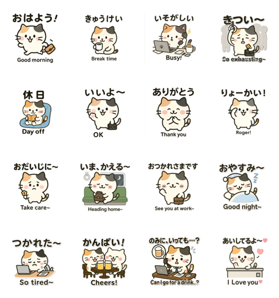 | スタンプ説明 | 三毛猫のねこのすけが、ビジネスや日常の会話をやさしく彩ります。 かわいいけれど可愛すぎない、落ち着いた大人向けスタンプです。 日本語と英語の勉強にもぴったり! |