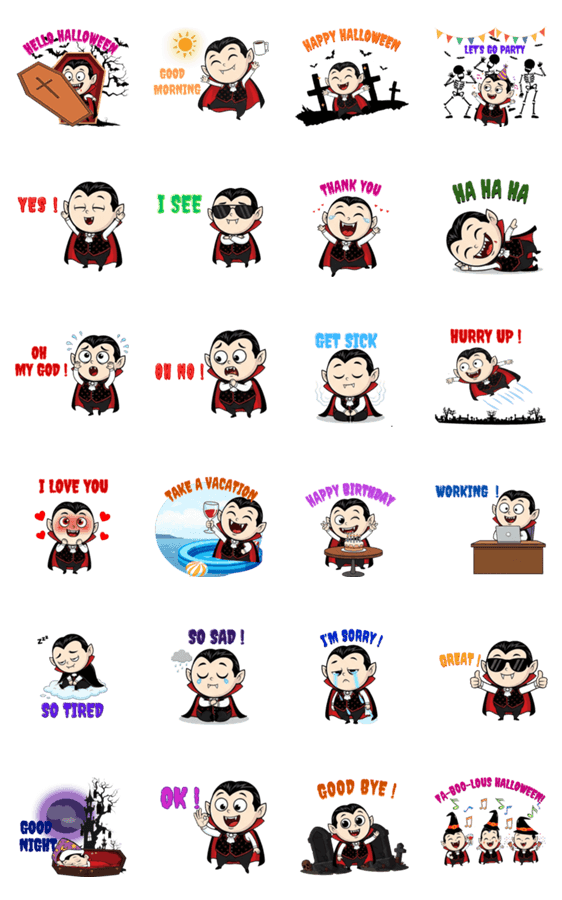 | スタンプ説明 | Halloween has become associated with Dracula, ghosts, and graveyards, all of which are seen having fun and chatting with people on LINE stickers. |