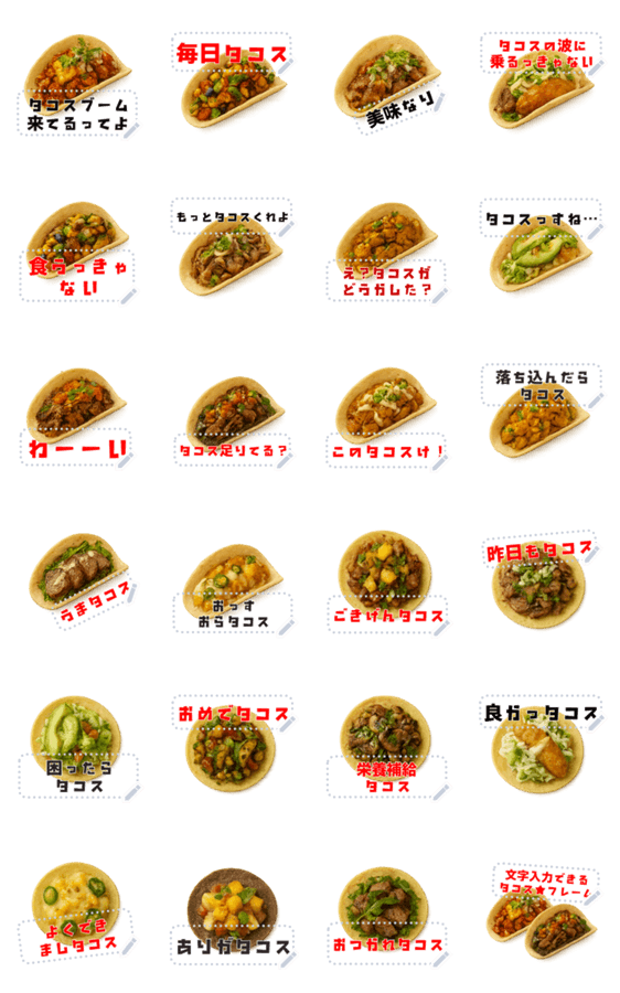 空欄に文章を書き込めるのでいろんなトークが可能! メキシコ料理のタコスが今、密かなブーム!楽しいリアル系食べ物メッセージスタンプ♪文字あり版スタンプも販売中♪ 現在この商品は一部のスマートフォン版LINE 10.3.0以上のトークルームでのみ使用できます。動作環境の最新情報はヘルプをご確認ください。