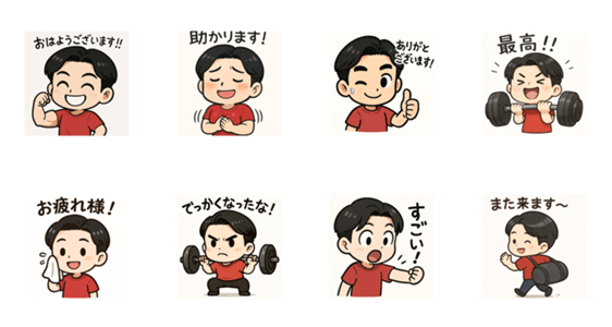 筋肉質な彼氏(七三分け)が日常で使えるコミカルなスタンプ!「でっかくなったな!」など、筋トレ用語を交えたポジティブなメッセージでトークルームを盛り上げます。