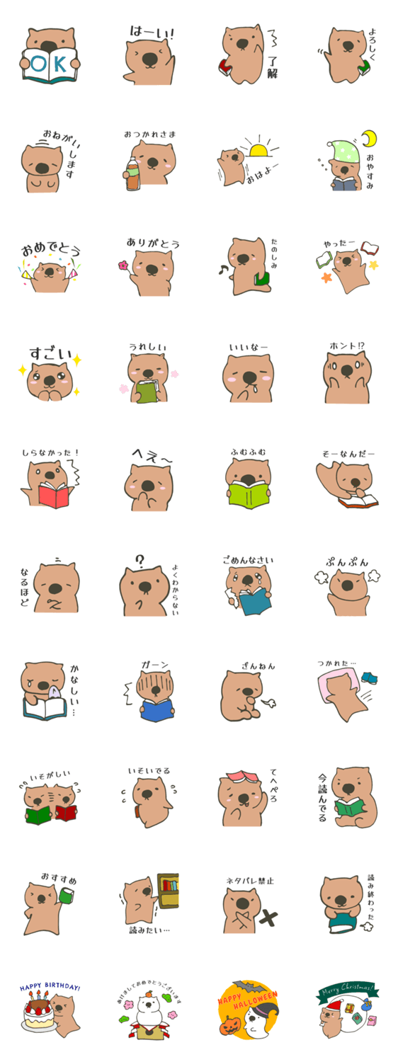 本好きなウォンバットです。 日常使いしやすいあいづちスタンプ、季節のメッセージスタンプ、読書好きの人向けのスタンプをセットにしました。