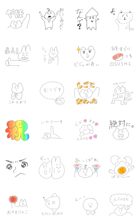 やほー!またスタンプ作っちゃった! 今回はなんといとこのみーこも作ってくれたよ〜! モノクロと言いつつカラフルなのもあるね