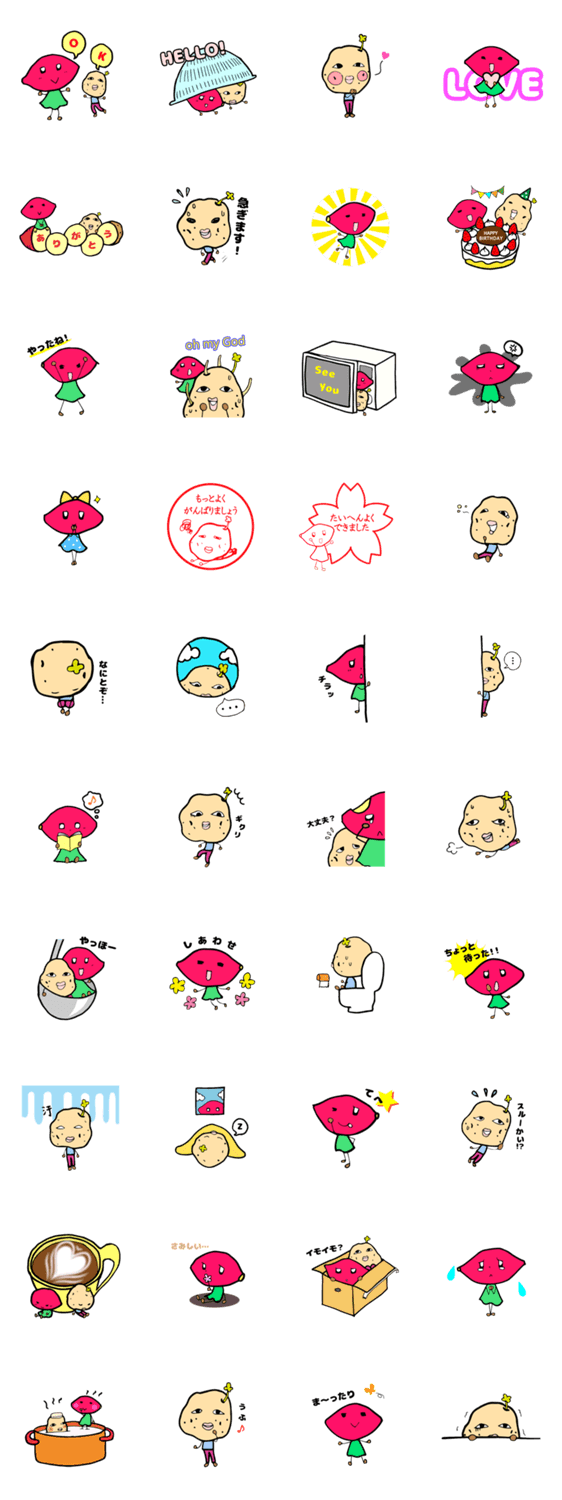 さつまいものイモ子さんと、じゃがいものばれいしょ君のゆかいなスタンプです。