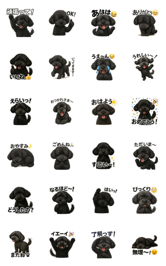 もふもふ黒トイプードルが、毎日の「ほっこり」をお届け。 あいさつ・リアクション・ひとことに使いやすい、癒しのスタンプセットです。