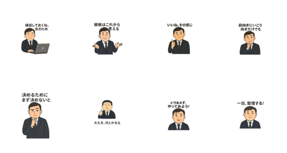 | スタンプ説明 | 職場にいそうな前向きな同僚「すすむ」。抽象的だけどポジティブな仕事の言葉で、日常を軽やかに盛り上げます。 |