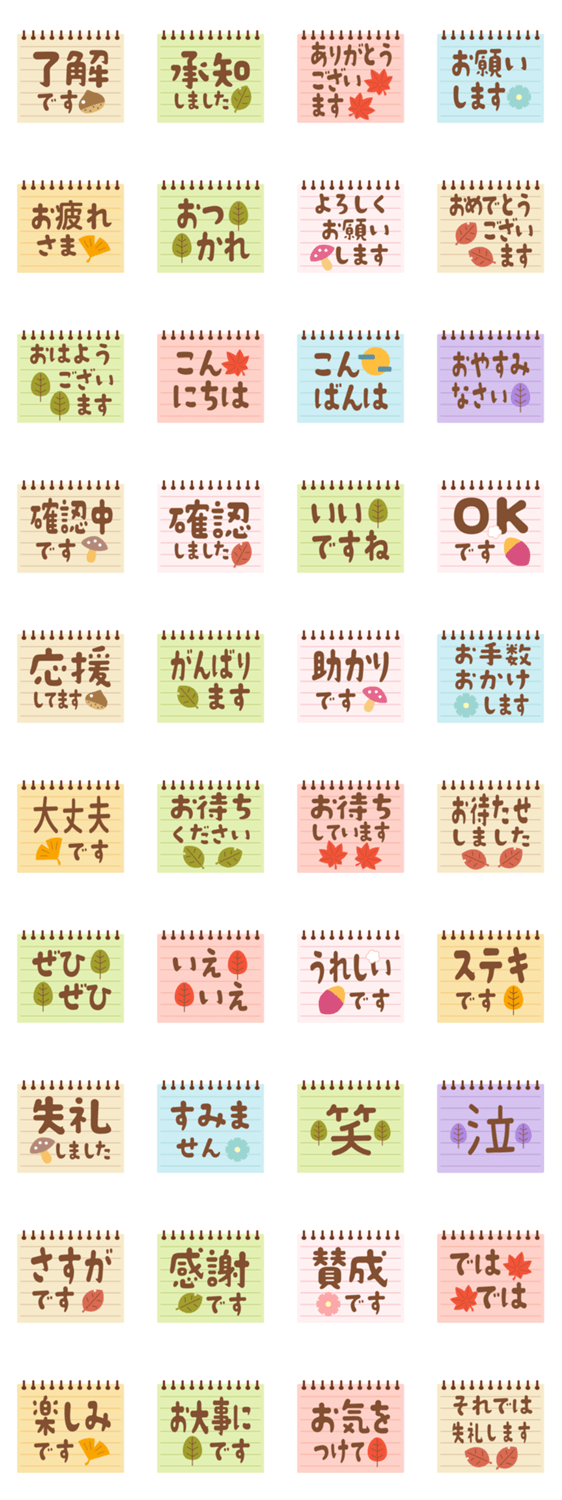 | スタンプ説明 | 簡単な返信で使いやすい、メモ帳風のカラフルでシンプルな敬語のスタンプの秋版です。了解です/承知しました/お疲れさまです/ありがとうございます など。 |
