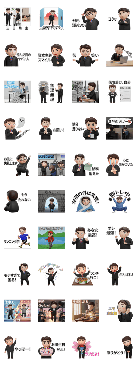 仕事も遊びも全力!定時ダッシュ、メール地獄、残業確定…。 リアルで笑える佐藤主任の日常スタンプ。疲れたときも、一緒に頑張ろう。