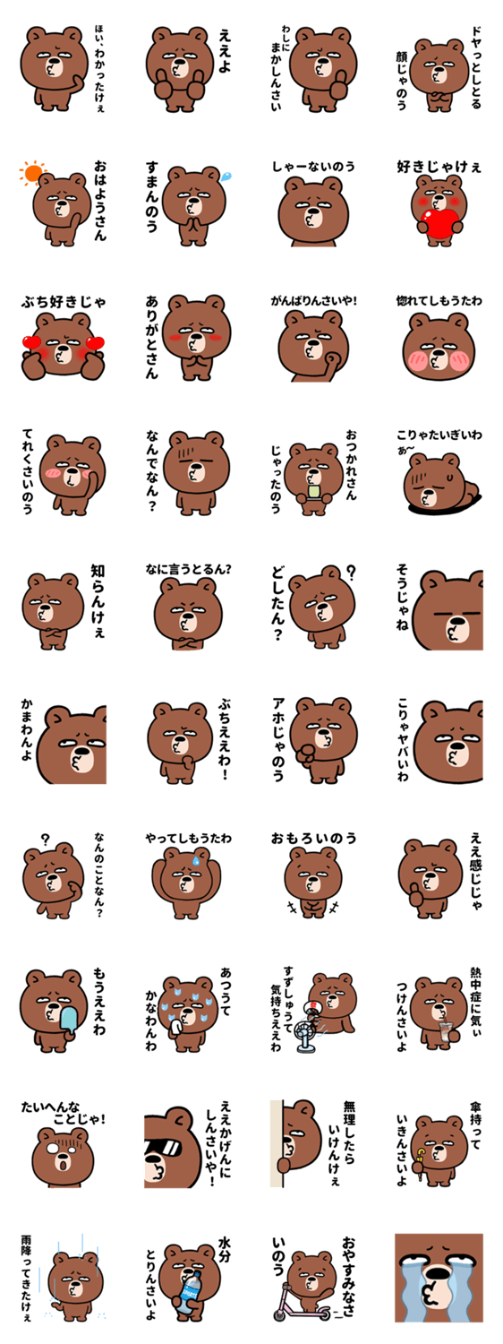 目つきの悪い熊が、ぶち広島弁でツッコミまくる!クセになる表情と語尾で、会話にインパクトをぶち込んでいきんさい!