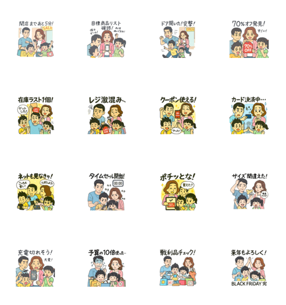 ブラックフライデーを楽しむ家族のスタンプ! セール開始、クーポン使用、ポチッとな!など、お買い物シーンが満載。 友達とのトークを盛り上げよう!