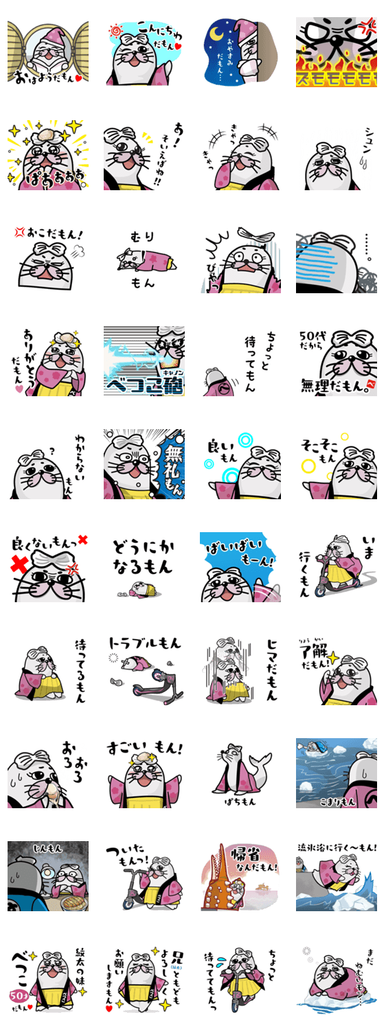 | スタンプ説明 | 紋別市のマスコットキャラクターの紋太の妹、べつこ(ゴマフアザラシ)です。 |