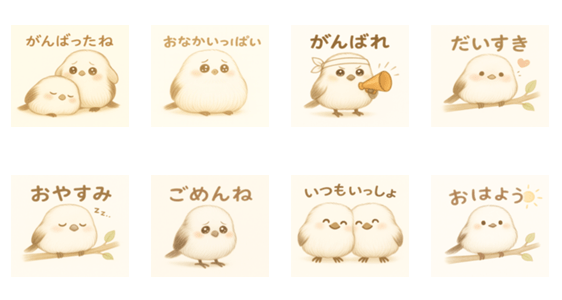 ふわふわの小鳥トリさんが、やさしい気持ちを届けます。かわいくて癒やされる日常スタンプ。おやすみ、ありがとう、がんばれなど、毎日使えることばを集めました。